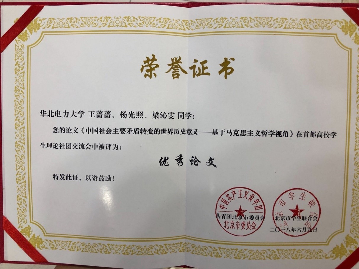 公司王蔷蔷同学及其社团成员所撰写的论文《中国社会主要矛盾转变的世界历史意义——基于马克思主义哲学视角》获评交流会优秀论文